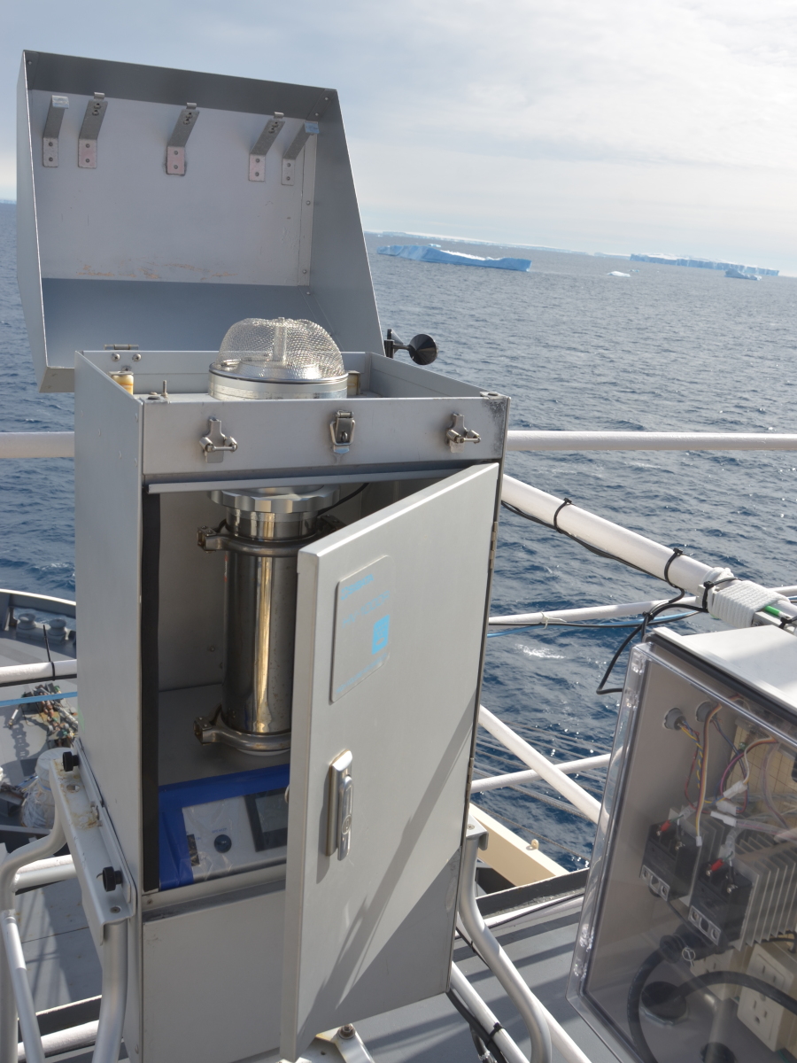 大気中に浮かぶ微粒子(我々は大気エアロゾルよ呼んでいます)を調べるために掃除機のように空気をたいさん吸引してフィルター上に集めます.そのフィルターは日本に持ち帰って調べたい成分がどのくらい含まれているか測定します.氷山が浮かぶ寒空の中,フィルターをセットして測定を開始しました.(小)
