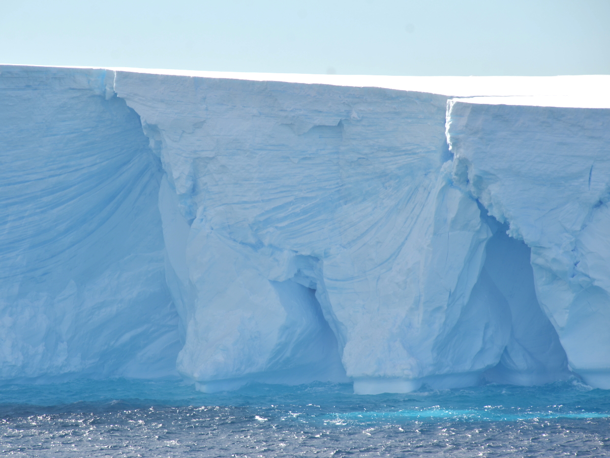 トッテン氷河の沖合に到着しました.大きな氷山がゴロゴロと浮かんでいます.写真だと大きさの様子がわかりづらいですが,ビル数階建てに相当する大きさです.表面は割れたときの影響でしょうか,真っ平らではなく複雑な形になっています.(小)