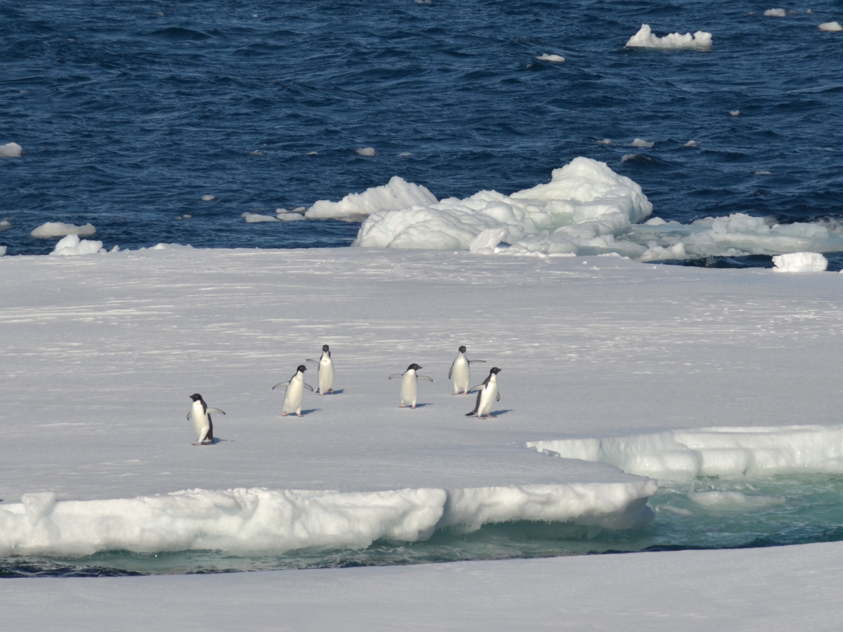 氷山でくつろいでいたアデリーペンギンがしらせに驚いて逃げまどっています.後ろにいるペンギンが逃げる方向を指示して,前にいるペンギンがそれぞれ左右に別れて走っているように見えました.驚かせてしまって申し訳ないですね.(小)