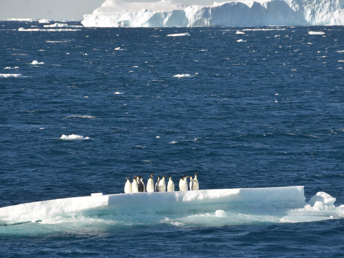 今度はコウテイペンギンの集団が小さいな氷山にのって現れました.昭和基地周辺ではなかなか会うことが出来ないコウテイペンギンですので,感激してしまいました.集団でどこに出かけるのでしょうか.(小)