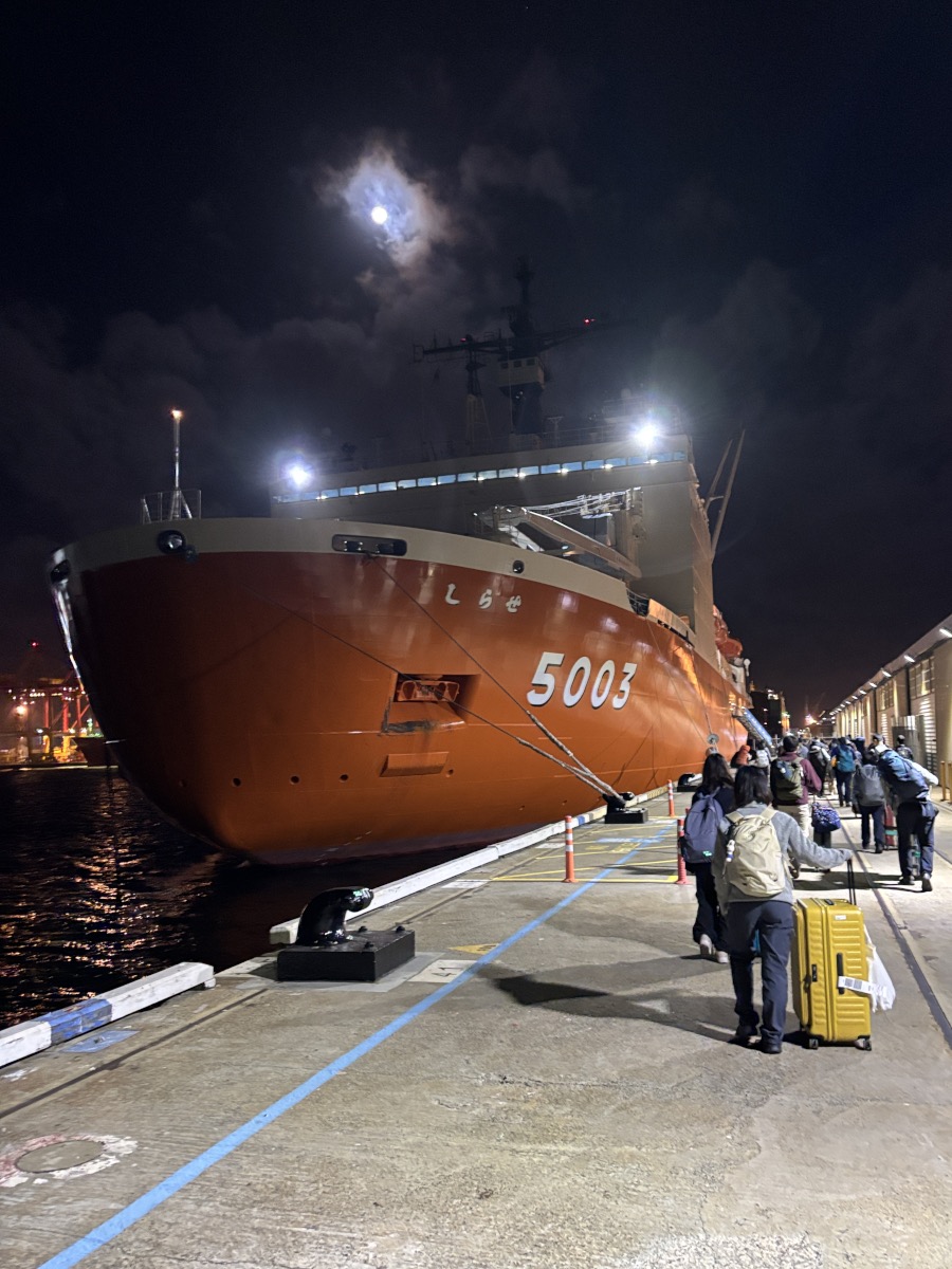 成田空港を出発し約9時間のフライトを終え,ようやくオーストラリアのパース空港に到着しました.そこからバスに乗り,現地時間12月4日22:30ごろ,南極観測隊はフリーマントルに停泊している南極観測船「しらせ」に乗船しました.測器の設置などで何度か訪れたことのあるしらせですが,南極観測隊に参加する立場としてみるしらせはより頼もしく見えました.(杉)