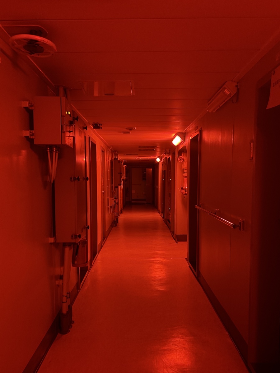 日没後,船内のすべての電灯は,闇夜に慣れた眼を保護するために赤灯に切り替わります.全ての電灯が赤灯に切り替わるので,ホラーゲームのワンシーンのような異様な雰囲気に包み込まれます.慣れないうちは,赤灯になってる間に歩き回ってもいいのか不安になりながらトイレに向かったりしていました.(杉)