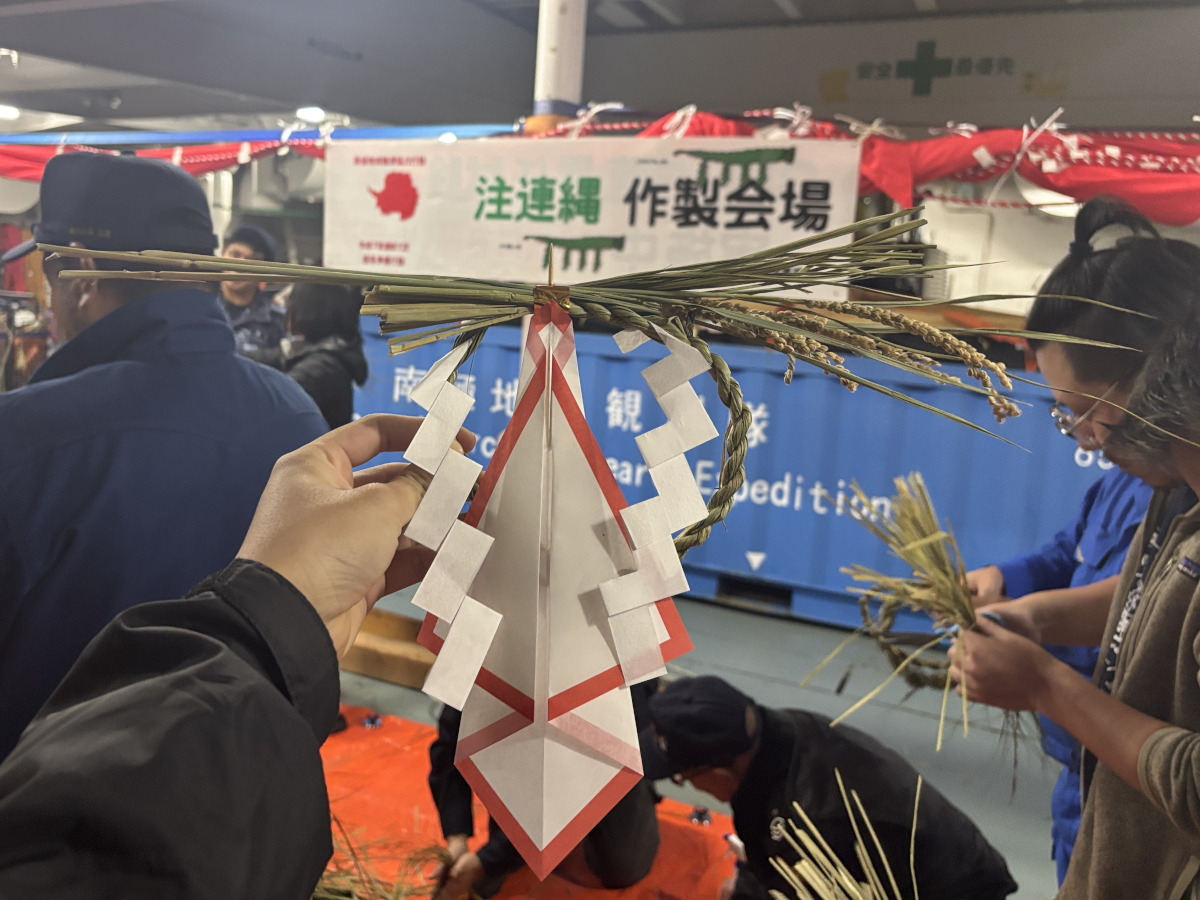 しらせでしめ縄づくりを行いました.この日は餅つき大会も同時に行われ,船内は新年ムード一色でした.しめ縄を個人で作れると思っていなくて,開催されることを知ってからどのように作るのか楽しみにしていました.しらせ乗員に教えていただきながら作ってみたところ,すごく簡単に作ることができました.写真は自分が作ったしめ縄です.日本でも再度作ってみたいと思います.(杉)