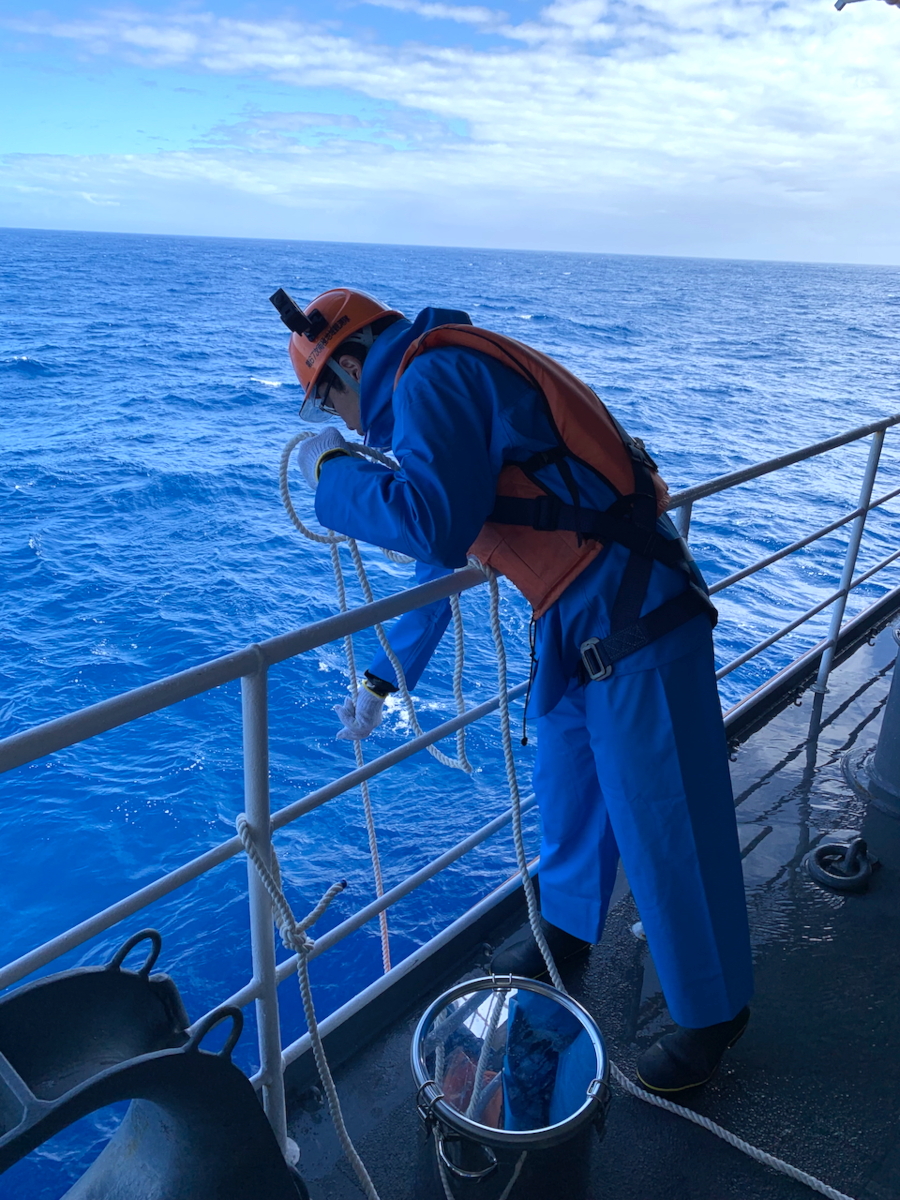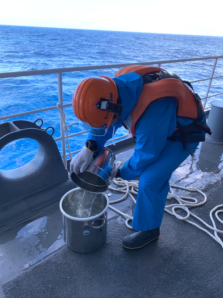 海水中に含まれるナノプラスチックを調べるために表層海水をバケツで採水しています.非常に濃度が低い(まだ南大洋は汚染されていない?)ことが予想されるため沢山の海水をろ過して,フィルター上に懸濁物を集めます.ろ過量が多く,また植物プランクトンも存在するためろ過に時間がかかります.半日からときには一日作業になることもあります.(小)