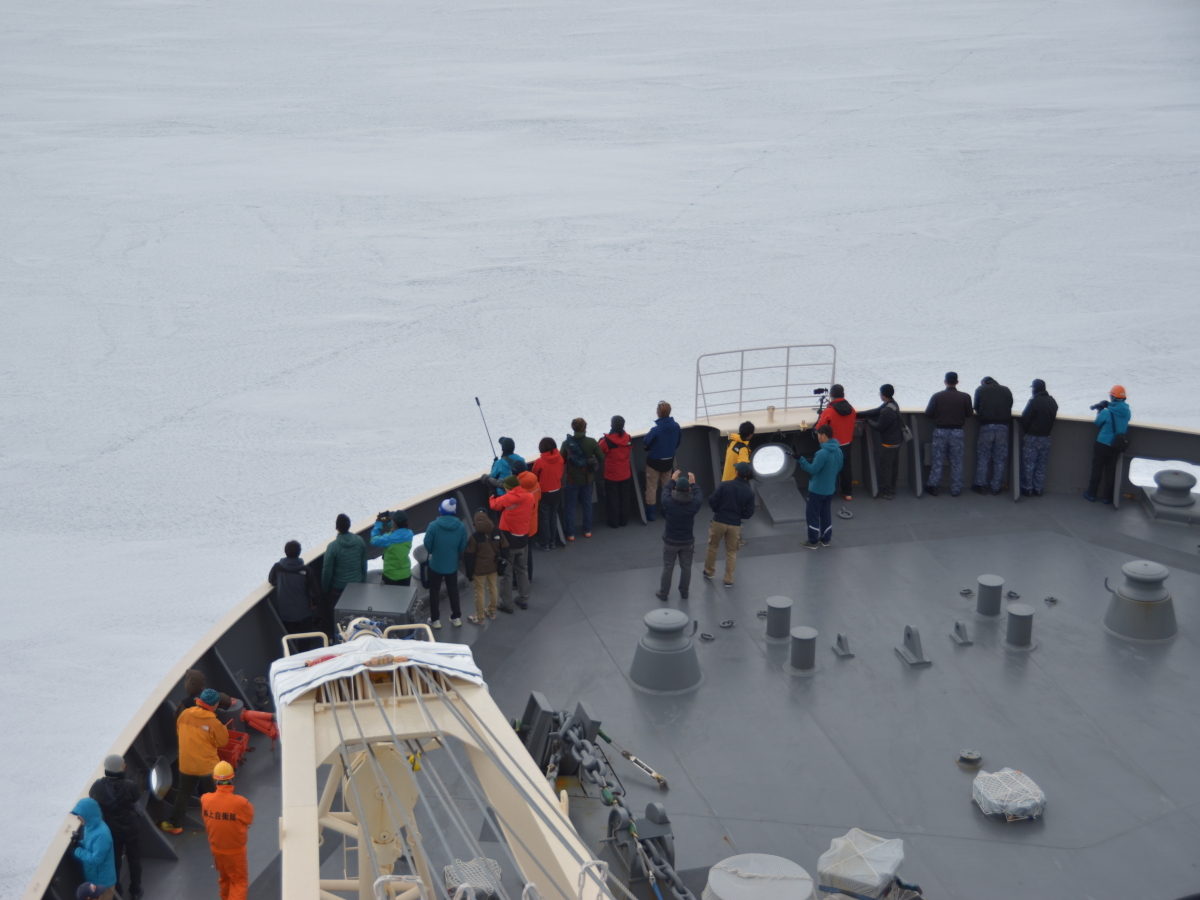 南極観測船しらせの船首に沢山の人だかりで出来ています.観測隊員や乗員はカメラを構えていますので,何かを撮影しているようです.何を撮影しているのでしょうか.(小)