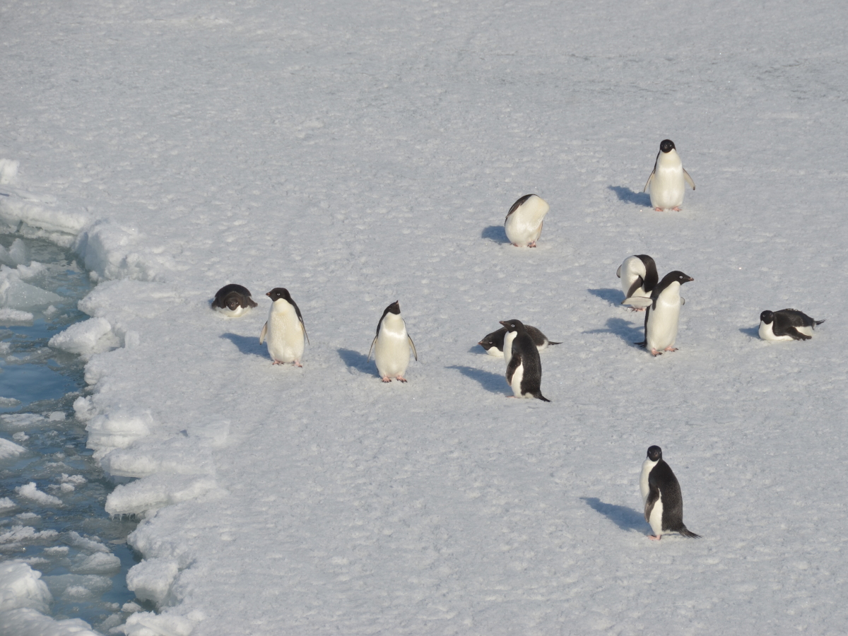 南極観測船しらせの直ぐ側で寝ていたペンギンたちが目を覚ましたようです.朝日を浴びて胸元が輝いています.今日はどこへ向かうのでしょうか?(小)