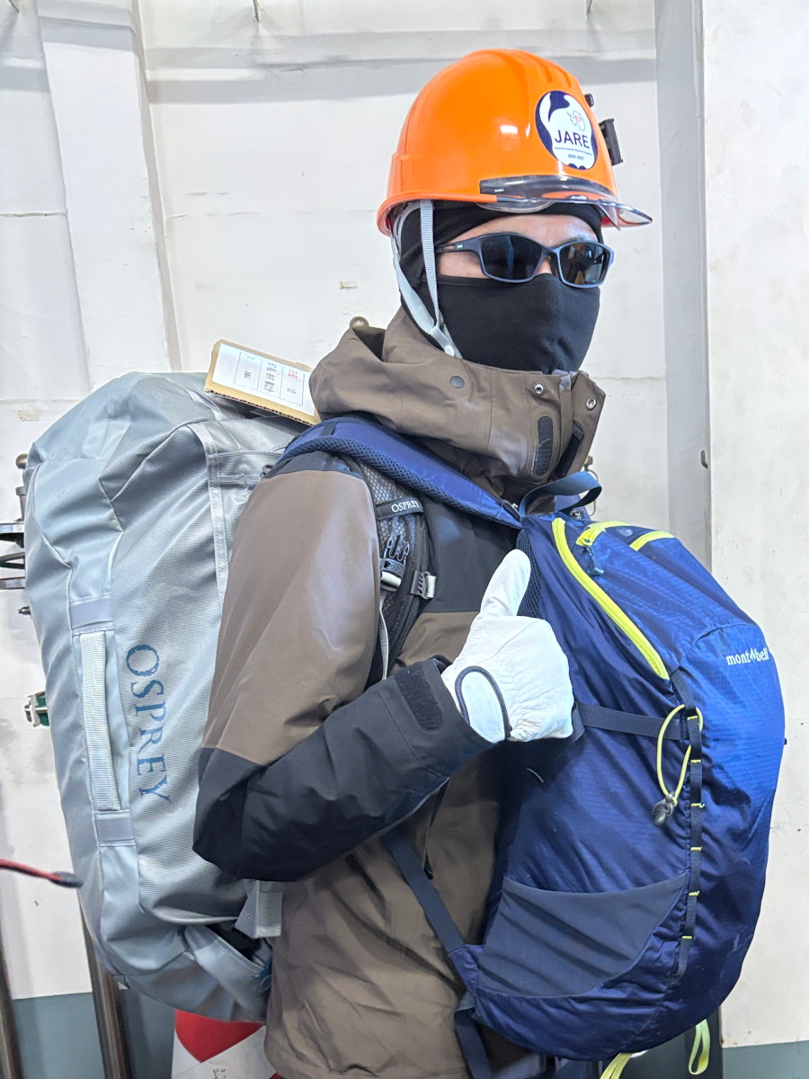 南極観測隊しらせから昭和基地へは,ヘリコプターで移動しました.ヘリコプターに乗るのは僕にとって初めての体験でした.一人当たり自分の体重と荷物を含めて100キロ以内に収めるようにと言われ,荷物が収まるか心配しました.また,飛行中,揺れるのではと不安になりとても緊張しましたが,乗ってみると想像より安定感がありとても楽しい飛行体験でした.(杉)