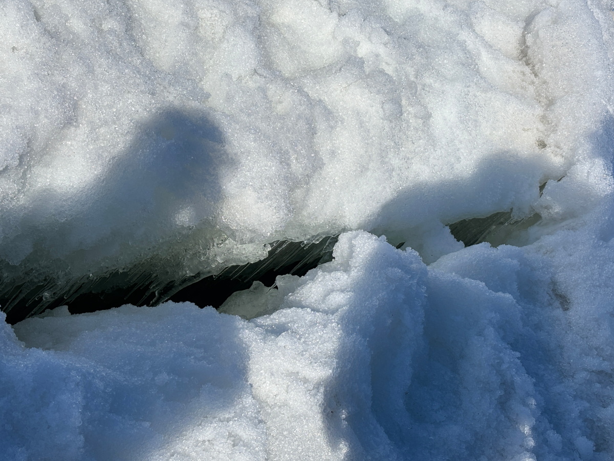 昭和基地に到着し,まず海氷上を歩く練習「氷上歩行訓練」を実施しました.陸地と海氷の境目には「タイドクラック」と呼ばれる視認しづらい深い溝があります(一枚目の写真).その溝を避けるために,ゾンデ棒と呼ばれる棒で海氷上を突いてタイドクラックの有無を確認します(二枚目の写真).どこがタイドクラックなのかとても分かりづらく、海氷上で行動する際の危険を感じることが出来ました.(杉)