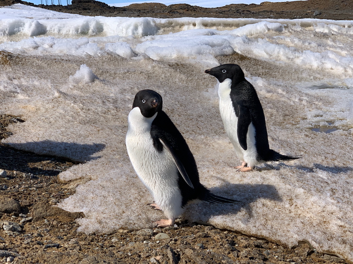 境省から観測隊に参加している職員の調査に同行することになりました.目的地は昭和基地がある東オングル島の池です.歩いていると,何やら動く物体?を発見しました.よくよくみるとペンギンたちでした.彼らも我々に興味を持ったのか,どんどん近づいてきました.こんなところでペンギンとバッタリ出会えるのも南極ならではですね.(小)
