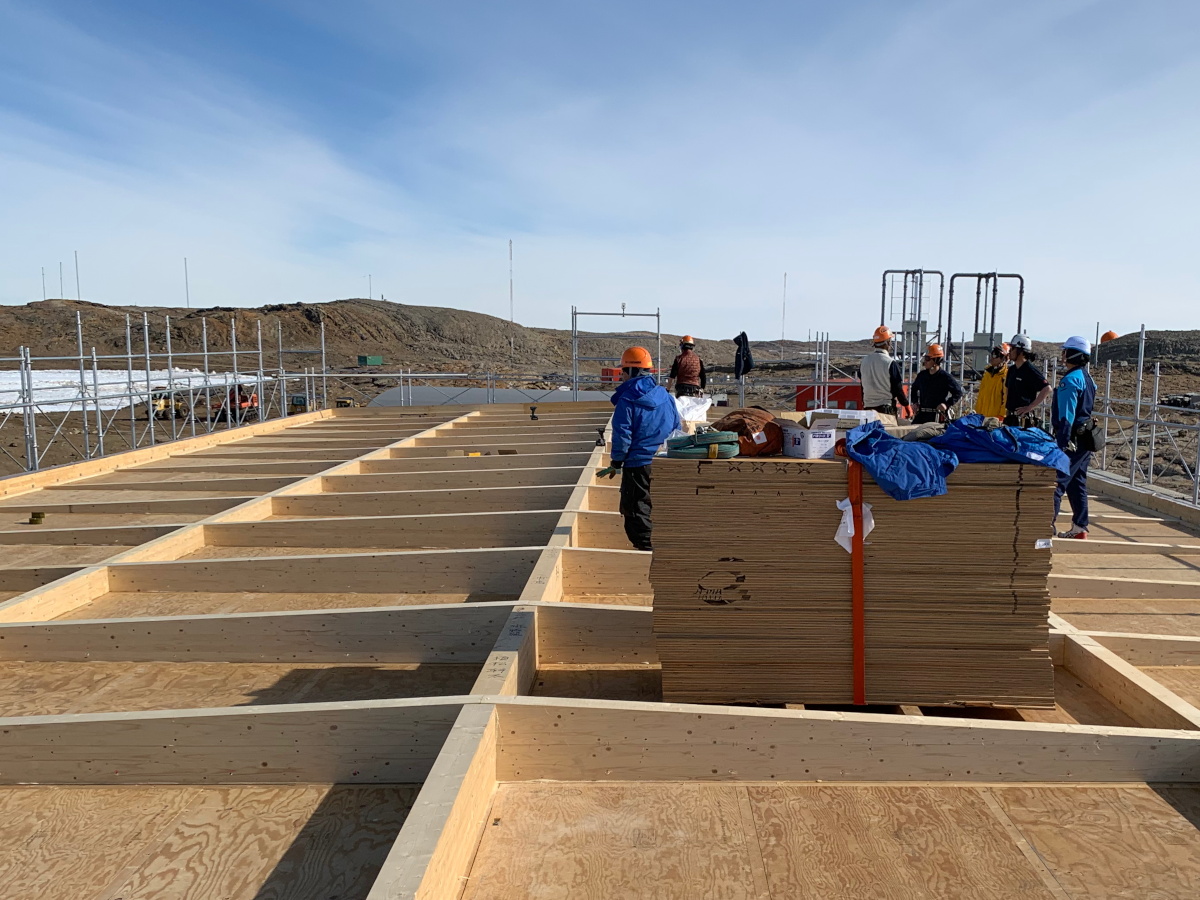自分に関係する作業がないときには,他の部門の作業を支援します.私は建築作業を支援しました.写真は「新夏宿」の作業現場です.「夏宿」とは,観測隊員が昭和基地に到着し,基地の管理・運営を始めるまでの間,生活する場所のことです.現在の夏宿は,2箇所に別れていることや水回りに制約があること,手狭であることなどから新しい夏宿の建築が数年前から始まりました.完成はしばらく先になるそうですが,新しい夏宿に泊まってみたいですね.(小)