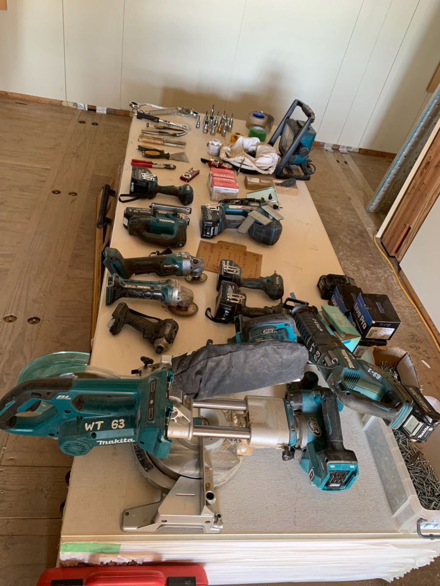 建築作業では作業内容に合わせ様々な電動工具が使われています.使ったことがあるものもあれば,初めて見るものもあります.今は充電池の性能が上がったため,電源コードを引き回す必要がない充電式の工具が主流になっているそうです.私はDIYを趣味としていますので,欲しい工具ばかりでした.(小)
