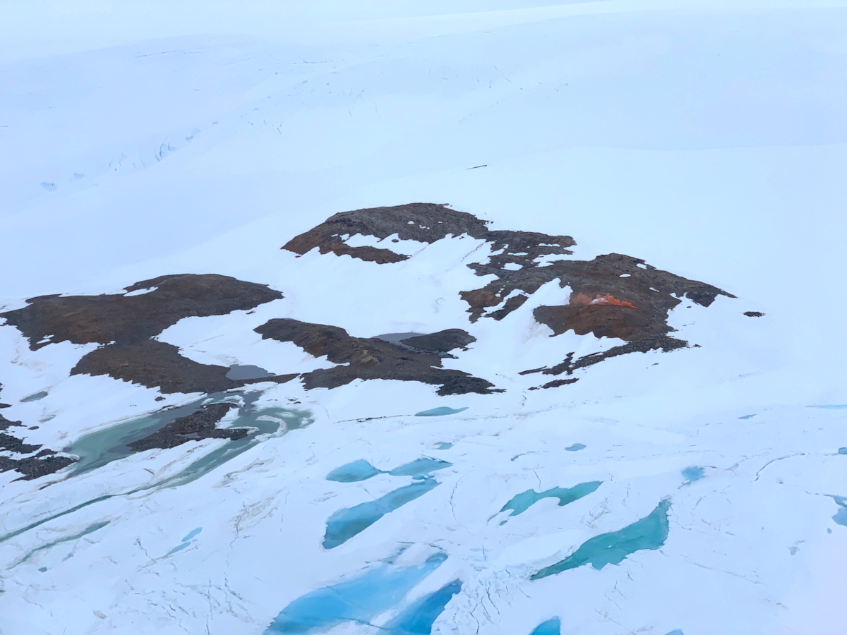 国土地理院の基準点(地図や測量の基準になります)設置作業の支援のため,リュツォ・ホルム湾奥部のベルナバネと呼ばれる露岩に出かけました.ここは南極大陸の岩石が地表面に現れているところになります.南極観測船しらせのヘリコプターに搭乗し,昭和基地から30分ほどで目的地であるベルナバネが見えてきました.写真の通り,まさしく岩石以外に何もないところで,少しだけ不安な気持ちが湧き上がってきました.曇天でわかりづらいですが,露岩の向こう側が南極大陸です.オレンジ色の煙は,風向を知るために投下した発煙筒によるものです.(小)