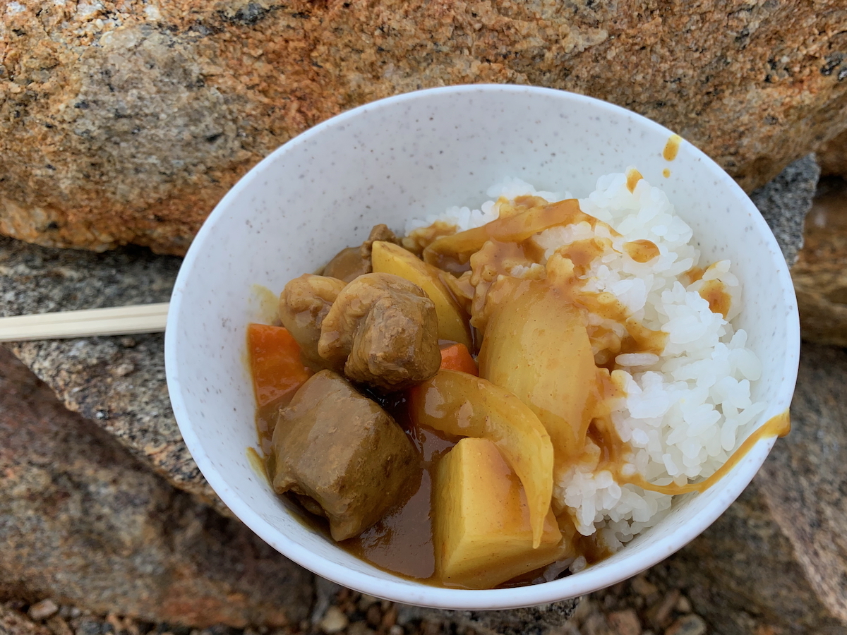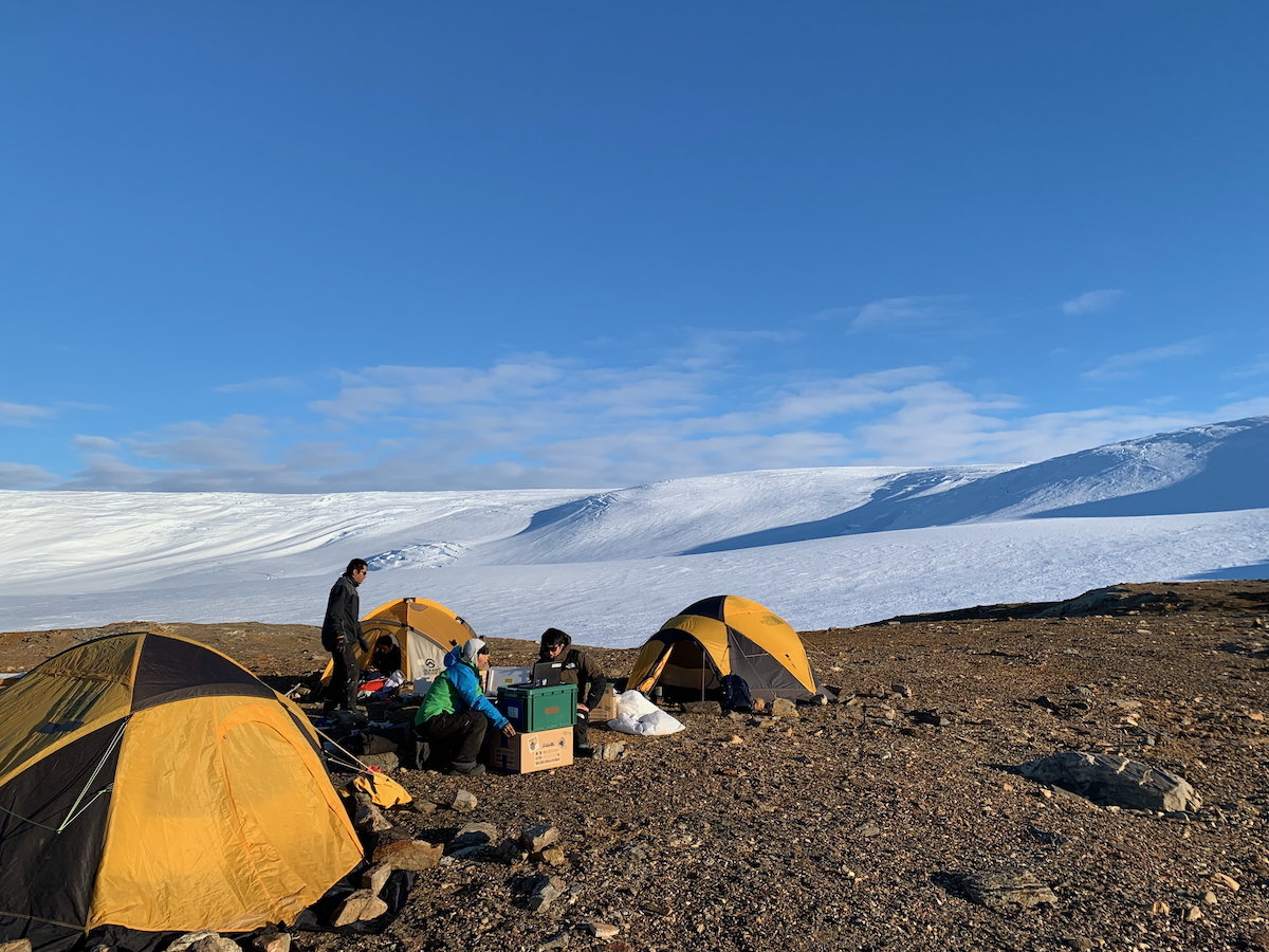 ベルナバネには,国土地理院から参加している隊員と野外活動を支援する隊員,北見工業大学と山梨大学の大学院生,そして私の総勢5名で滞在しました.小屋などは無いため,テント泊です.全員で協力し,テントを張り,食事を作りました.初日の夕食は野外での定番,カレーです.吹きっ晒しの寒い屋外で食べる温かいカレーは本当に美味しかったです.(小)