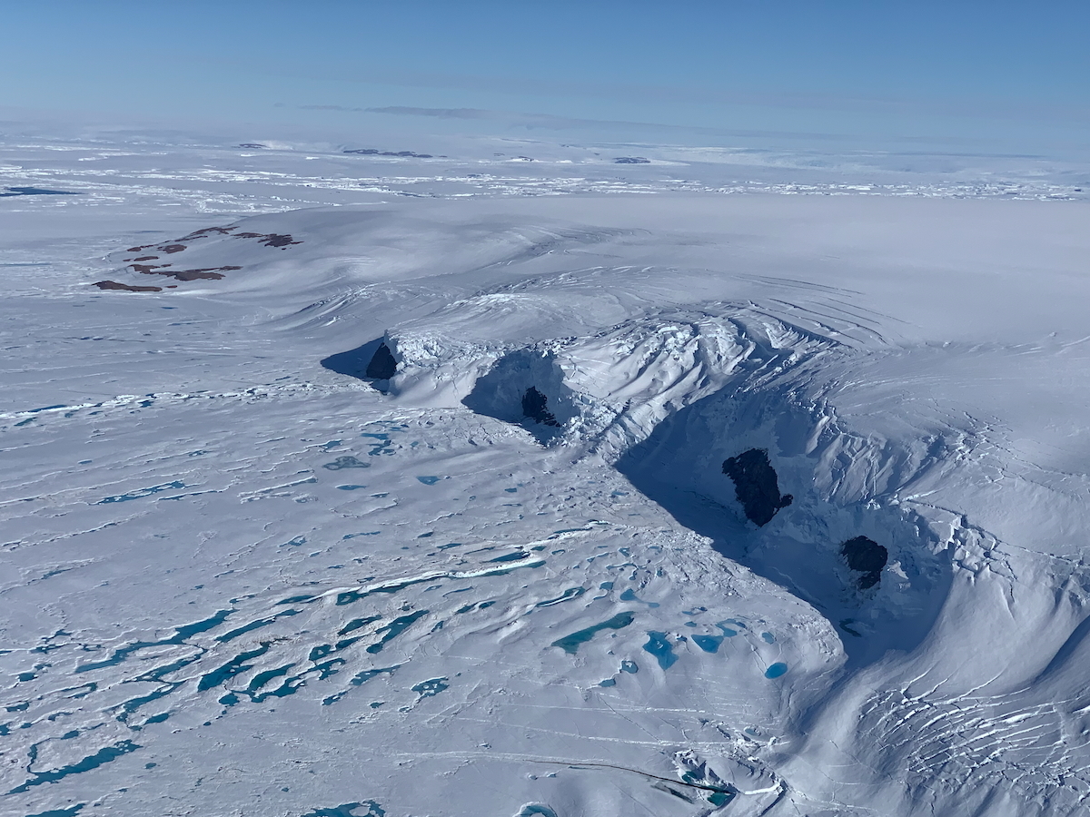 ベルナバネから昭和基地へ戻る際にヘリコプターから「四つ目岩」と名付けられた露岩を見ることが出来ました.まさしく四つ目でした.露岩の右上側が南極大陸,左下が凍結した海です.海氷上にはパドルと呼ばれる海氷が融けた水たまりが出来ています.(小)