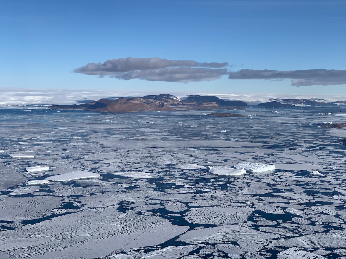 こちらは昭和基地から近く,野外調査が活発に行われているラングホブデと呼ばれる露岩地帯です.アデリーペンギンのルッカリー(巣)やコケや地衣類などが繁茂する沢があります.写真をよくみると露岩地帯の上空だけに雲が浮かんでいます.露岩が太陽の光を浴びて暖められ,局所的な上昇気流が発達したのかもしれませんし,地形的な影響かもしれません.面白いですね.(小)