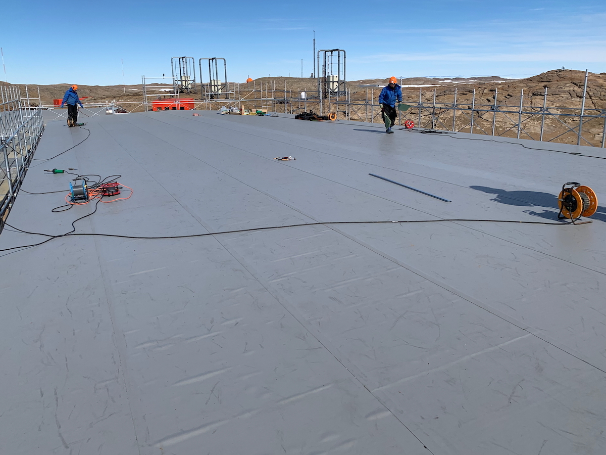 新夏宿の屋根に防水シートを貼る作業を実施しました.長いロール状の防水シートを裏返しに広げ,屋根の下地材のベニア板と防水シートに接着剤を隙間なく塗っていきます.その後,数人がかりで防水シートをひっくり返しながら,接着剤が密着するように押しつつ貼っていきます.大変な作業ですが,我々観測隊員だけではなく,しらせの乗員も支援に加わり,あっという間に貼り終えました.南極の厳しい風雪や日射から建物を守ってくれるはずです.(小)