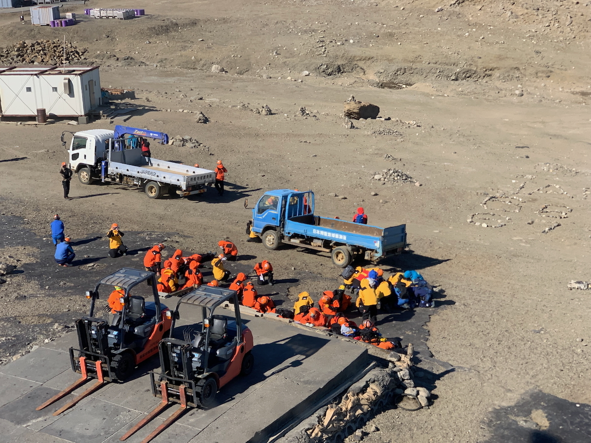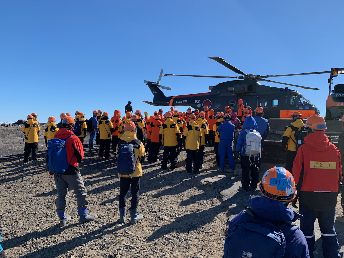 この日は,66次越冬隊から我々と一緒に南極にやってきた67次越冬隊が基地の維持・運営を交代する式が行われました.式が終わるとヘリポートに移動し,66次のみなさんはヘリコプターに乗り込み,昭和基地を去っていきます.私は機器トラブルの対応のため,急遽,前日の夕方に南極観測船しらせに戻り,66次隊を迎えにいくヘリコプターに搭乗して昭和基地に戻りました.昭和基地に着いたときにはみなさんヘリポートに集まっていました.ヘリコプターが吹き下ろすダウンウォッシュと呼ばれる風は非常に強いため,この写真のようにじっと風が収まるのを待ちます.その後,67次の我々が見守る中,66次のみなさんはしらせへと飛び立っていきました.(小)